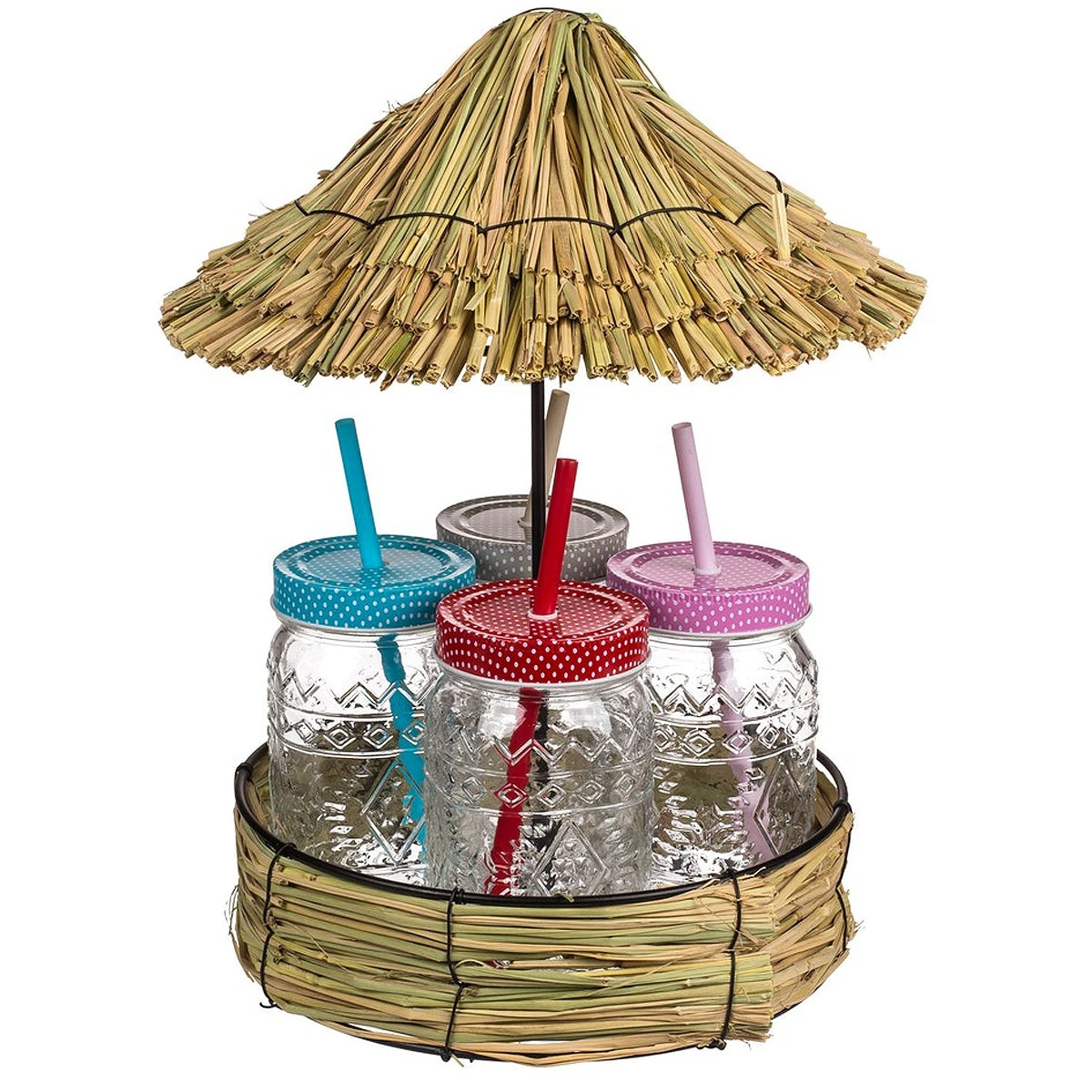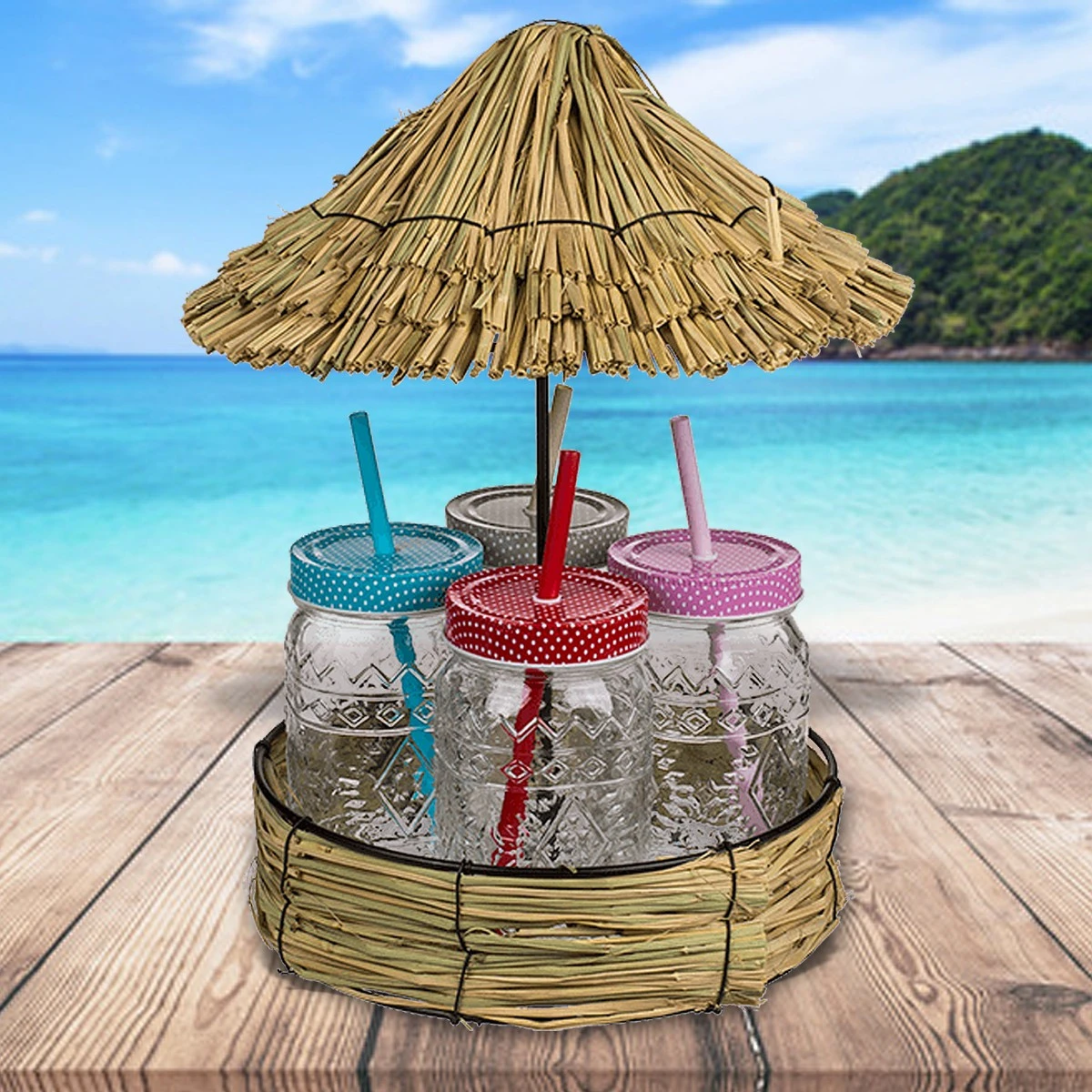 - Adorable service à cocktail avec plateau couvert d’un toit en paille style tropical et 4 mason jar avec couvercle et paille intégrée réutilisable.