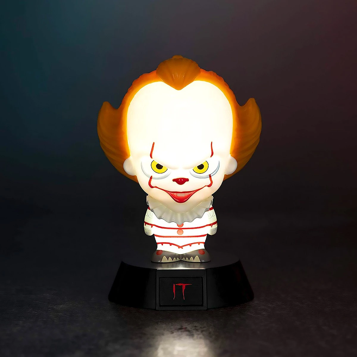Illuminez votre chambre avec la , le de Stephen King. Cadeau parfait pour les amoureux du célèbre roman « çà » de Stephen King et de ses adaptations cinématographiques, cette veilleuse reprend les traits terrifiants du clown « çà » du dernier film. Visage blafard, regard jaune perçant et sourire diabolique exposant ses dents acérées comme des rasoirs, bon courage pour trouver le sommeil avec la sur votre table de chevet ! Même lorsque vous ne l’allumez pas, l’expression du clown est tout aussi menaçante. La est fabriquée sous licence officielle et sa finition est exemplaire. Cette petite lampe est alimentée par 2 piles AAA, faciles à changer. Un cadeau fantastique en général !