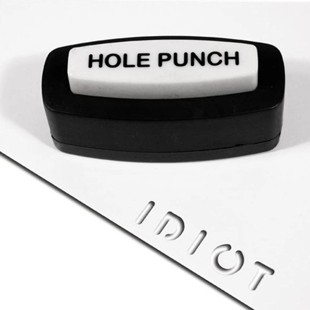 La Perforette insultante IDIOT ne mesure que 6,5 cm de largeur et elle trouve facilement ça place dans le tiroir du bureau. Si vos collègues pensent trouver une perforette standard pour classer leurs documents dans un classeur, ils ne vont pas être déçus lorsqu’ils utiliseront en cachette votre perforette. A la place des deux trous, ils pourront lire le mot IDIOT ! très drôle non (et irréversible) ?