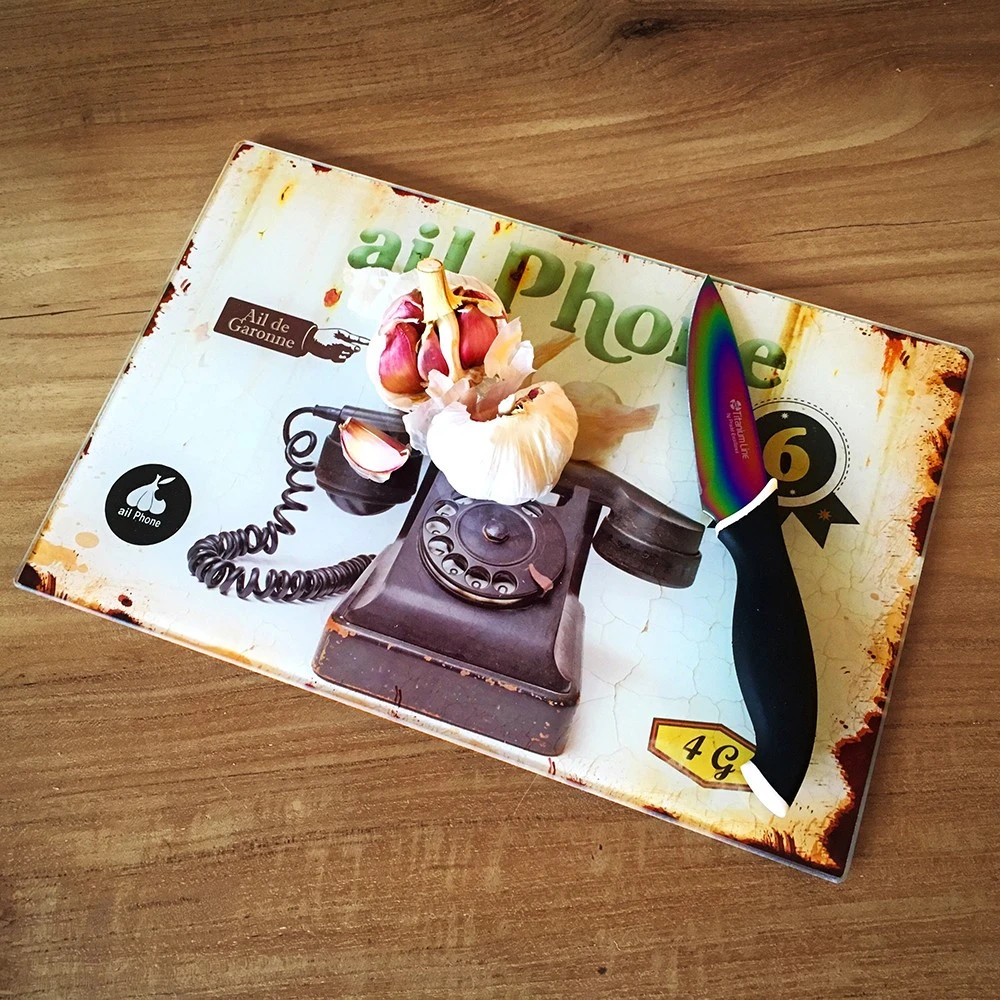 Vous l’aurez compris la est un clin d’oeil humoristique au célèbre smartphone à tout faire : . Ici, l’Ail-Phone ne nécessite aucun forfait particulier et d’ailleurs il ne vous propose qu’ Avec sa surface en verre trempé, vous bénéficierez d’une robustesse à toute épreuve vous permettant de bénéficier au moins d’un taux de transfert digne des normes de la 4G ( bien sûr, huhuhu…). Cette planche à découper est un cadeau à la fois original et utile avec une pointe d’humour. Ses dimensions sont parfaites pour limiter l’encombrement en ayant une zone de travail tout à fait correcte pour élaborer vos petits plats préférés.
