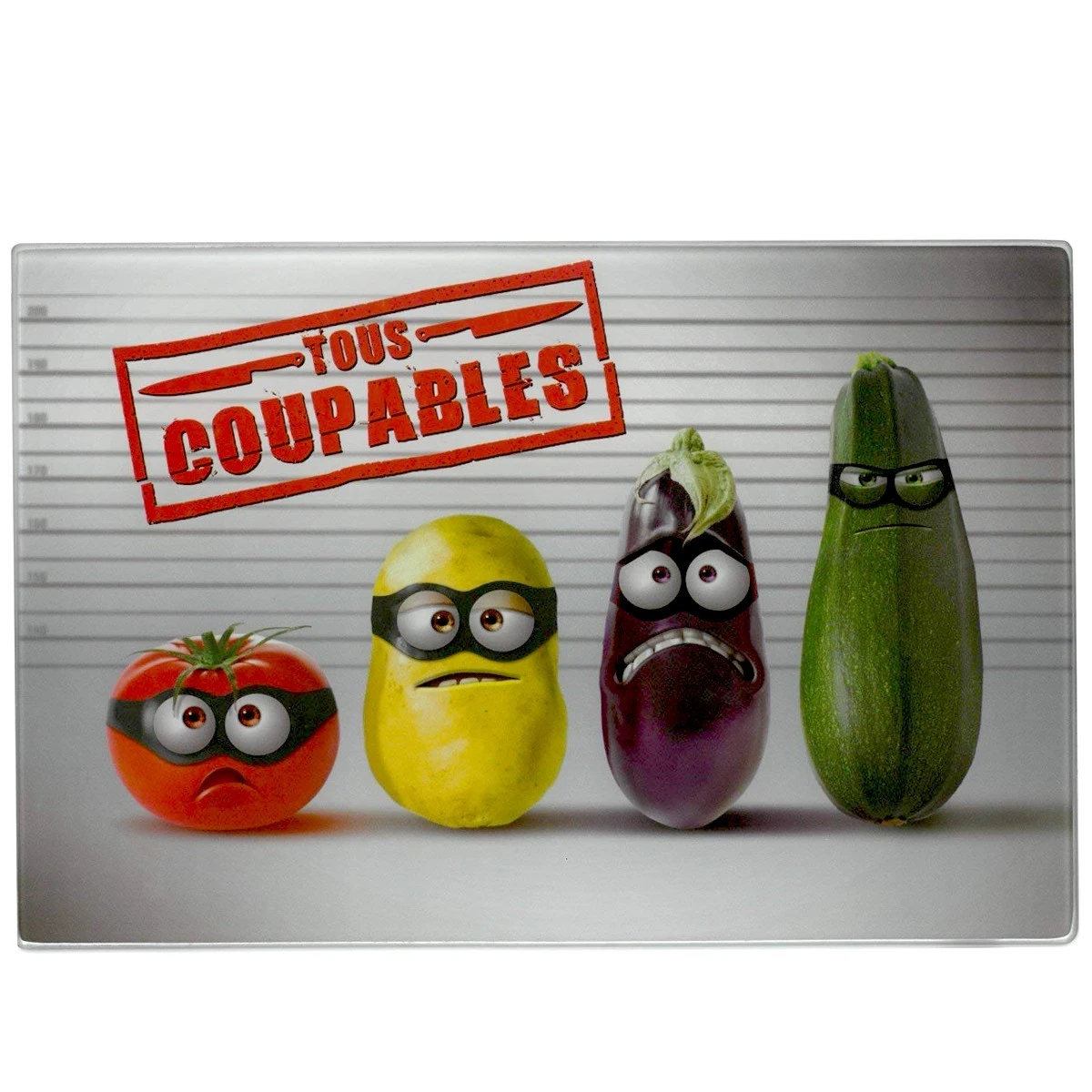 Cette planche à découper est l’ pour la cuisine. Avec une pointe d’humour culinaire, l’illustration de cette planche à découper est particulièrement réussie. On voit ainsi une tomate, une pomme de terre, une aubergine et une courgette alignées et masquées dans ce qui ressemble à une salle d’identification de la police. La mention « Tous coupables » est inscrite en caractères rouges et en majuscules. La Planche à découper Tous coupables est en et résiste à une température de 200°C. Les autres avantages ? surface anti-éraflures, robuste et stable avec un entretien simplifié par rapport à une planche à découper en bois. Si on lui rajoute son design amusant, on obtient un à offrir à une personne qui adore cuisiner !