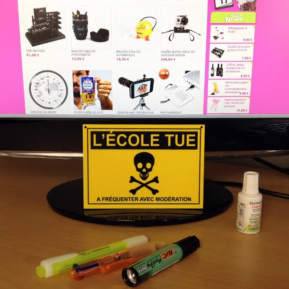 Rebelle ou élève modèle ? A vous de voir et d’annoncer la couleur sur la porte de votre chambre. Décalée, humoristique, la plaque de porte « l’école tue » ravira à coups sûrs les ados « en colère » contre le système scolaire ! (enfin, n’exagérons rien… ils continueront quand même à se mettre en rang par deux sagement).