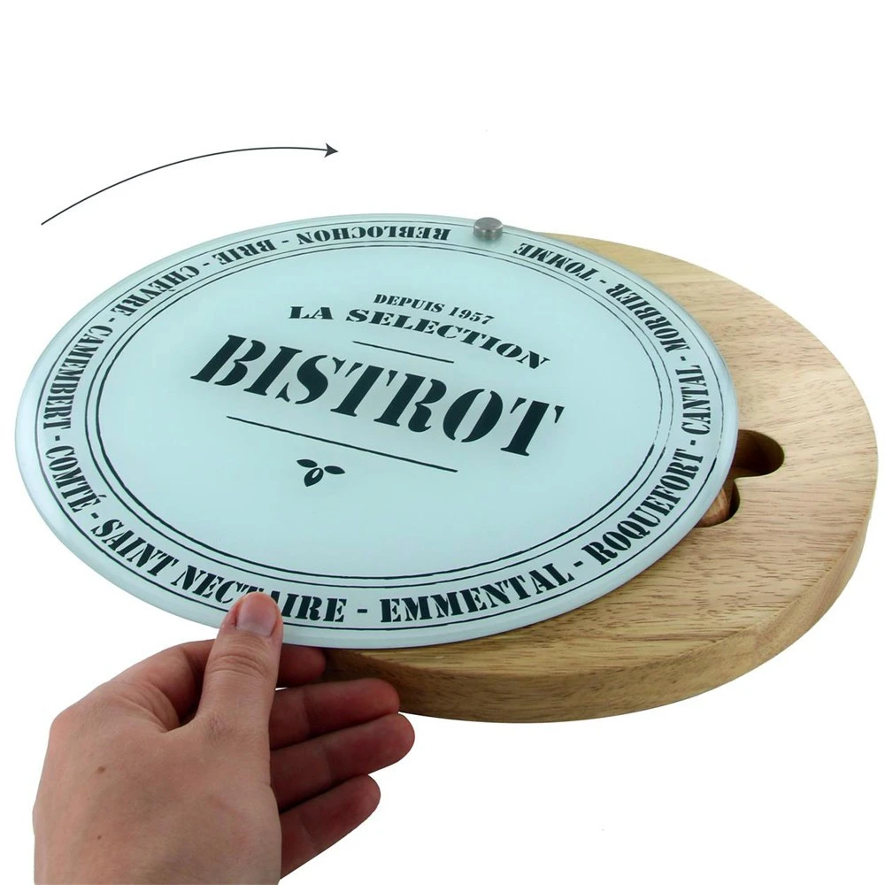 Servez vos fromages sur un . Ce plateau à fromage est très astucieux : il est équipé d’une plaque rotative en verre qui dissimule une cachette dans le socle en bois où sont rangés pour couper et trancher facilement tout type de fromage. Un couteau pointu pour les pâtes dures comme le parmesan, une fourchette à fromage pour maintenir pendant la coupe et une hachette pour les fromages à pâte dure. Un pour la table.