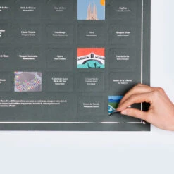 Vous visitez l’un de ces lieux sur le poster ? enlevez l’opercule gris du lieux visité et une vignette de couleur apparaîtra. Le but est que le poster gris qui symbolise la vie soit le plus coloré possible. C’est un peu comme un calendrier de l’Avent sauf qu’on meurt à la fin… Mais non voyons !! 😉 et heureusement ! Faites votre valise et bon voyage !
