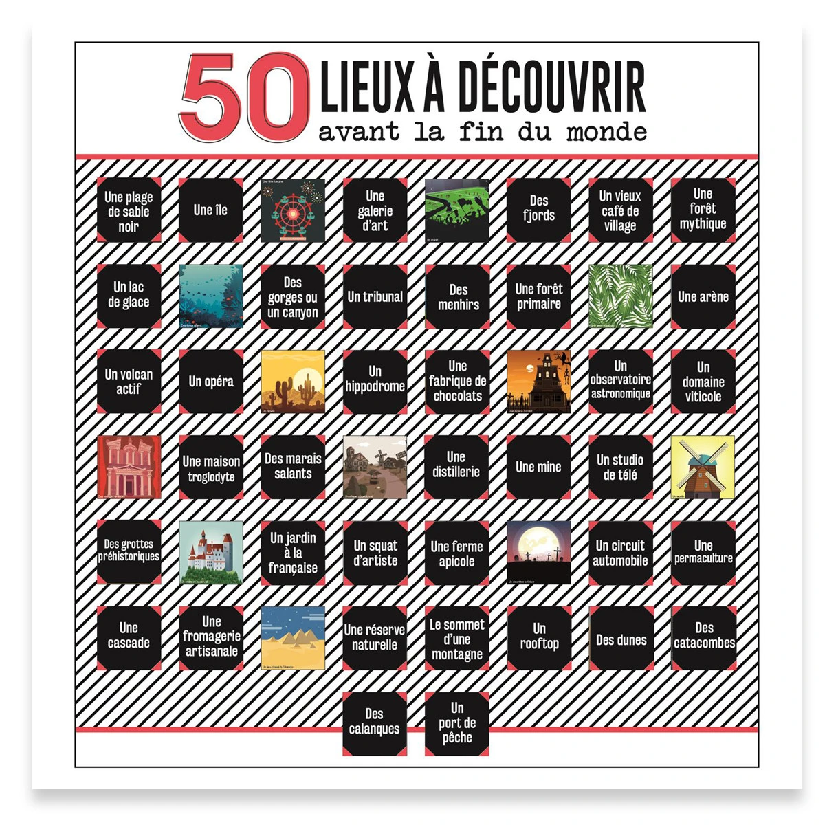 Le est votre guide ultime pour profiter de la vie avant que tout ne s’effondre. Ce n’est pas un simple poster, c’est un défi interactif. Chaque case détachable représente un lieu atypique à visiter. Une fois que vous avez visité le lieu, vous détachez la case pour révéler une image encore plus fascinante en dessous. C’est comme un calendrier de l’Avent, mais au lieu de chocolat, vous obtenez une dose d’aventure. Des lieux aussi variés qu’un lac de glace, une maison hantée, ou une fabrique de chocolat vous attendent. Et le meilleur ? Ces lieux sont si simples et si proches que vous vous demanderez pourquoi vous n’y avez pas pensé plus tôt. Alors, prêt à transformer l’apocalypse en une série d’aventures mémorables ?