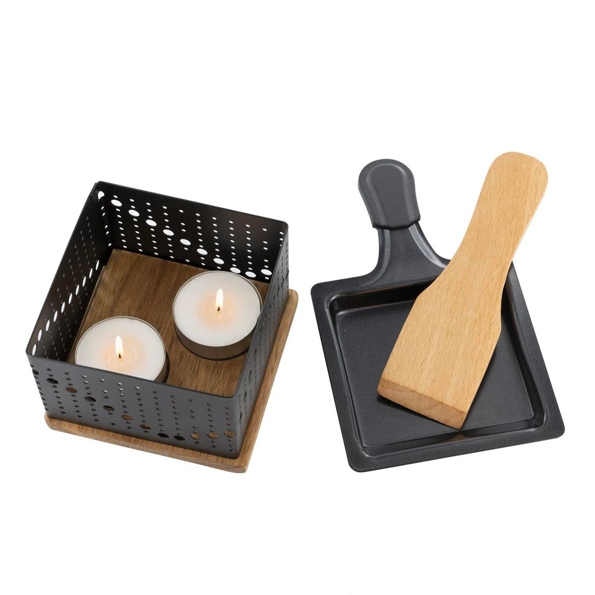 Plus besoin de sortir l’encombrant et énergivore appareil à raclette ! avec la vous pourrez vous faire facilement une raclette en quelques minutes, aussi rapidement qu’avec l’appareil électrique et sans consommer un watt ! Donc pas besoin d’électricité ni de rallonge électrique, il suffit d’allumer deux bougies chauffe-plats sur le socle. Posez le poêlon et le fromage à raclette fondra en une minute, aussi vite qu’avec un appareil à raclette électrique. Equipez-vous de cet ensemble à raclette insolite pour vous faire un petit plaisir gustatif en solitaire ou à plusieurs si vous vous équipez de plusieurs sets.