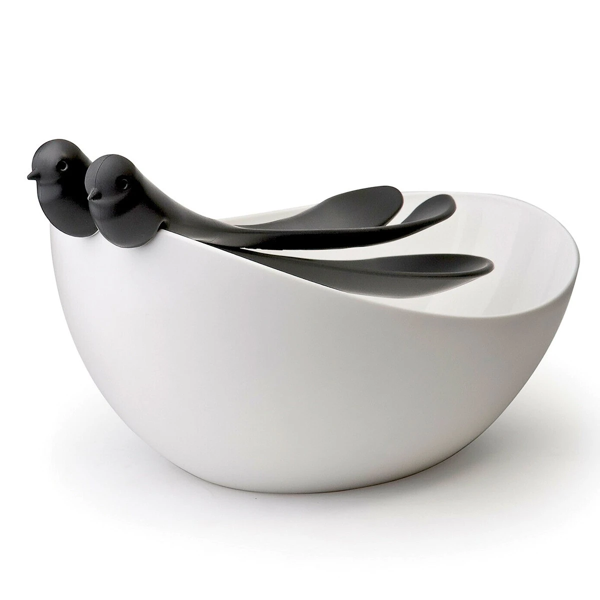 Le est un service à salade élégant et particulièrement original. L’ensemble est composé d’un saladier (le nid) et de deux couverts à salade ayant pris la forme de deux charmants moineaux. La fourchette et la cuillère se perchent sur le rebord du saladier comme le ferait un couple de petits moineaux. Chaque couple de moineaux s’aide et se soutient mutuellement pour construire son nid. Tout comme la fourchette et la cuillère, ils peuvent travailler séparément, mais ils sont plus efficaces lorsqu’ils travaillent ensemble. Le saladier blanc est asymétrique, permettant ainsi d’accrocher les couverts en hauteur par rapport au contenu du saladier. Le est un cadeau particulièrement original qui charmera les amateurs de salades.