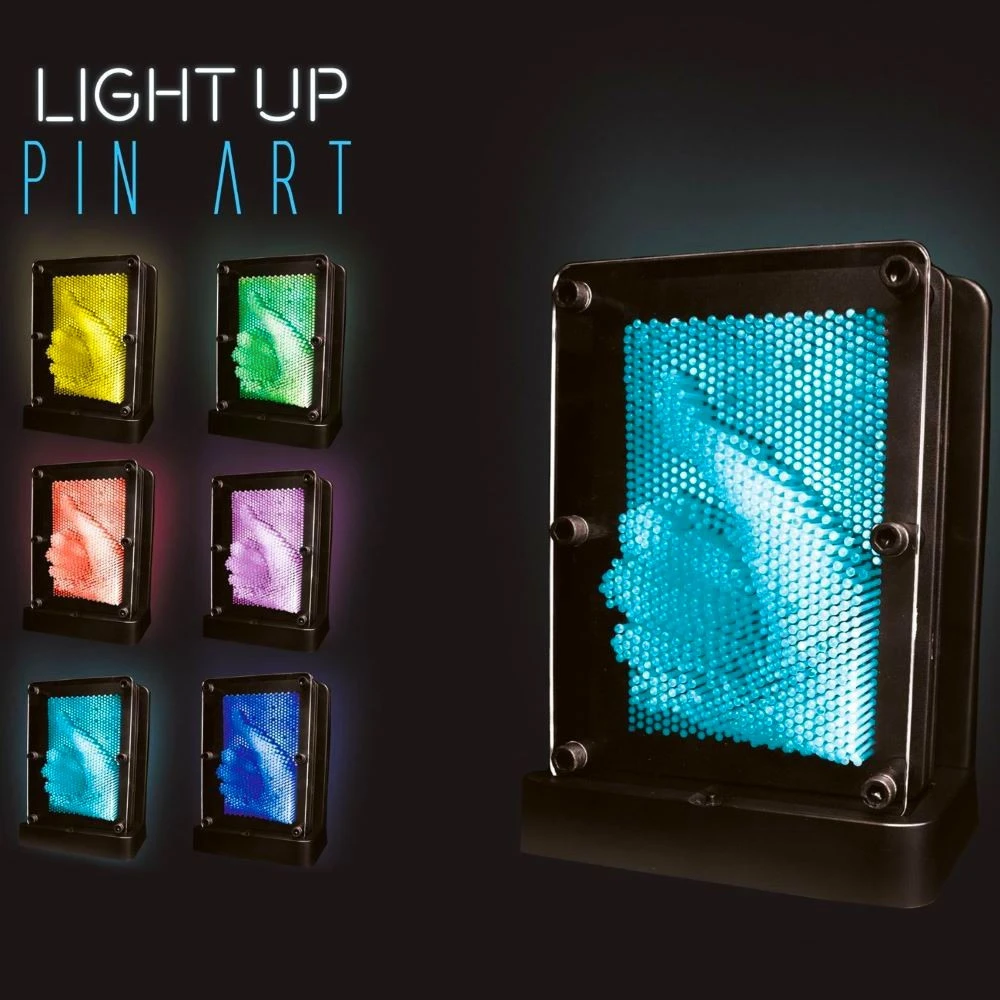 La sculpture clous 3D lumineuse a subi un cure de jouvence ! ce super gadget addictif est ! Vous pourrez désormais mettre en valeur vos sculptures les plus étonnantes avec un éclairage d’ambiance en un instant. Tout comme la sculpture clous originale, celle-ci est équipée de clous à une différence près : ils ne sont pas en métal mais en plastiques translucide qui un peu comme le fait la fibre optique. Faites votre oeuvre en collant par exemple votre visage sur les clous (sans pointes) et posez ensuite votre sculpture devant le support rétro-éclairé fourni. Miracle ! et passe progressivement par des couleurs chatoyantes violet, bleu, vert, jaune etc… Il est également possible de bloquer le changement de couleur si vous préférez une couleur fixe pour votre « oeuvre ». A la fois , votre sculpture clous n’aura jamais été autant mise en valeur ! un cadeau rétro qui aiment les objets à la fois .