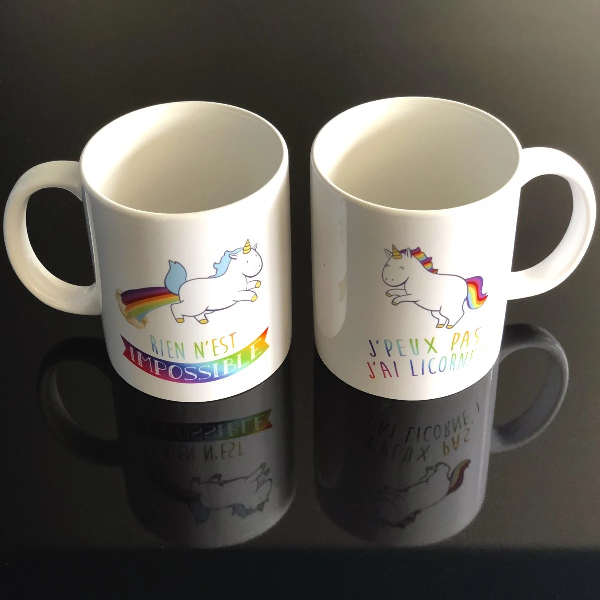 Sur ces deux tasses licorne est dessinée une jolie licorne stylisée et sont inscrites deux réponses décalées, dans le plus pur « esprit licorne », et qu’on peut donner facilement à toutes les questions en fonction de votre humeur du moment : « J’peux pas, j’ai licorne » ou « rien n’est impossible ». Le set 2 mugs Licorne vous permettra de en compagnie d’un proche avec une pointe d’humour. Ces deux mugs drôles feront un pour quelqu’un qui aime rire et qui apprécie particulièrement les licornes.