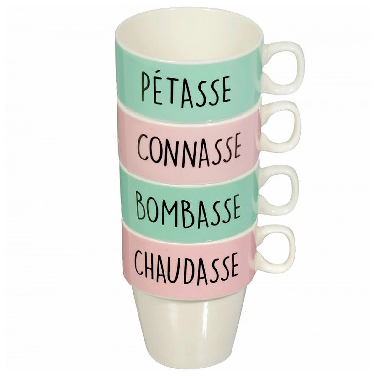 Un peu de second degré ou d’autodérision ne nuisent pas dans ce monde de brutes et cet ensemble de donne le ton avec humour. Quatre mugs avec quatre inscriptions différentes : Bombasse, Connasse, Pétasse, Chaudasse, une création fièrement revendiquée par les Vilaines Filles. Le est livré avec son support permettant un rangement facile et élégant dans lequel les 4 tasses de grande contenance (30cl) s’empileront avec une facilité déconcertante. Reste à savoir laquelle d’entre vous récoltera la tasse la moins flatteuse à la pause café, ce qui entre ne devrait poser aucun problème. A noter que les garçons peuvent tout à fait utiliser ces tasses ce qui provoquera sans doute de petits rictus nerveux.