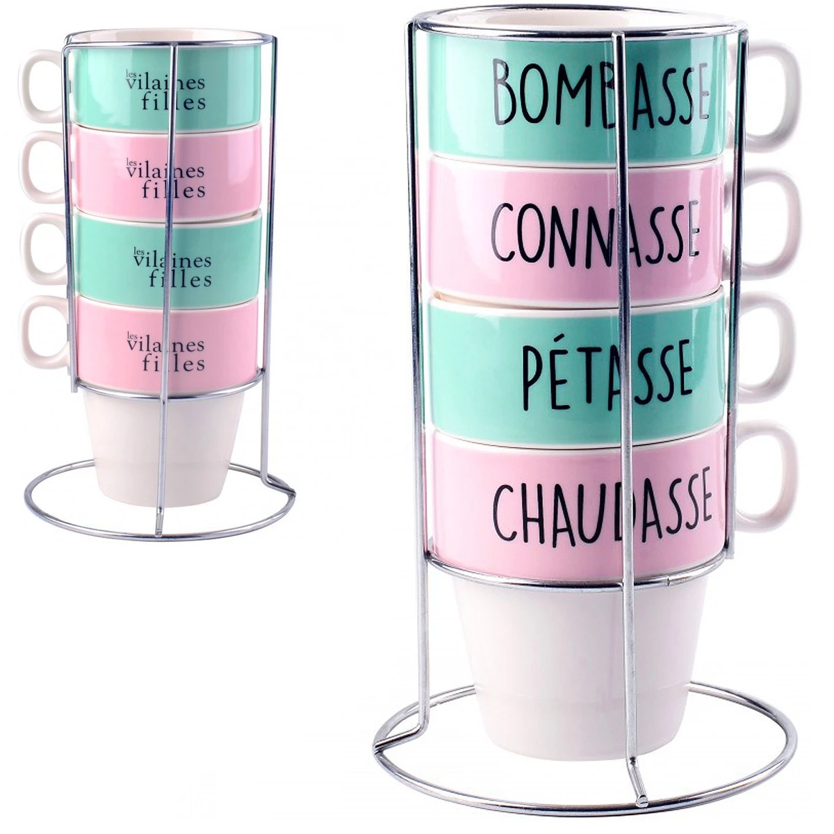 - Set de 4 tasses Vilaines Filles avec support,