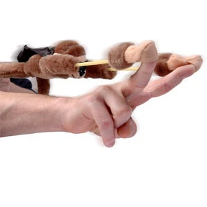 Des bras très élastiques, une cape et un masque de super héros, un sourire béat, un corps poilu et tout doux… il surgit de nulle part semblant fendre l’air avec son cri terrifiant (et terrifié) ! vous venez de faire connaissance avec notre super singe volant. Accrochez ses petites mains à deux de vos doigts, tirez sur son corps athlétique pour tendre ses bras élastiques tel l’arbalète de Guillaume Tell, puis relâchez soudainement ! Notre primate des airs sera dès lors catapulté à travers la pièce en criant d’effroi !… la pauv’bête…