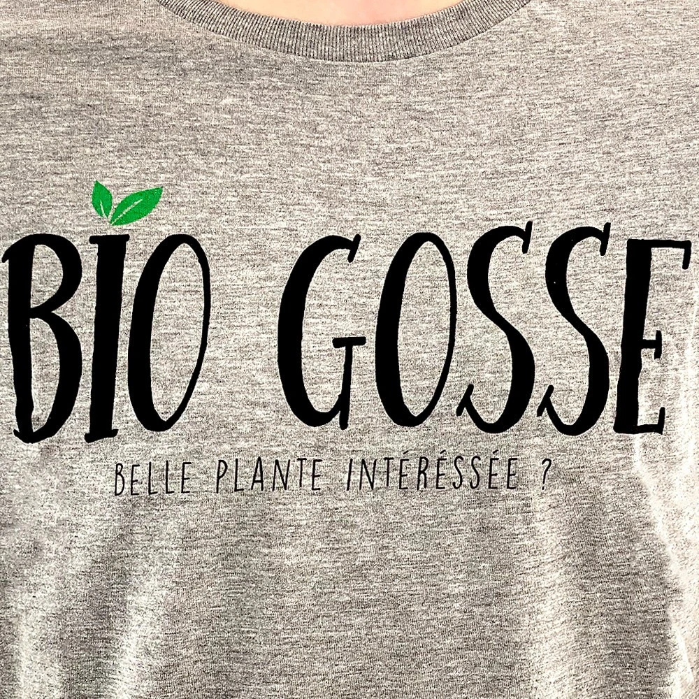 - couleur gris chiné, impression noire « Bio Gosse, Belle plante intéressée ? »,