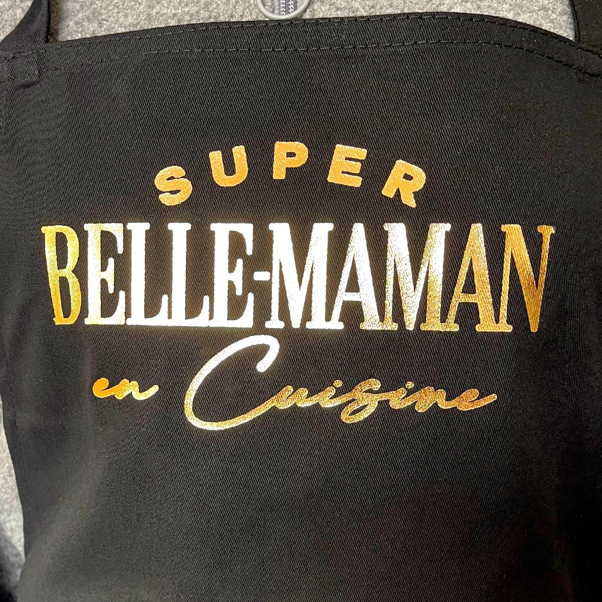 Votre belle-mère est toujours prête à mijoter vos petits plats préférés dont elle seule détient le secret pour vous faire plaisir ! quoi de plus naturel donc, que de l’honorer comme il se doit en lui offrant notre somptueux imprimé en doré de la mention suivante : « Super Belle-Maman en cuisine ! ». Ainsi équipée et flattée, votre Belle-Maman ne pourra que mieux s’appliquer à vous concocter des mets exquis.