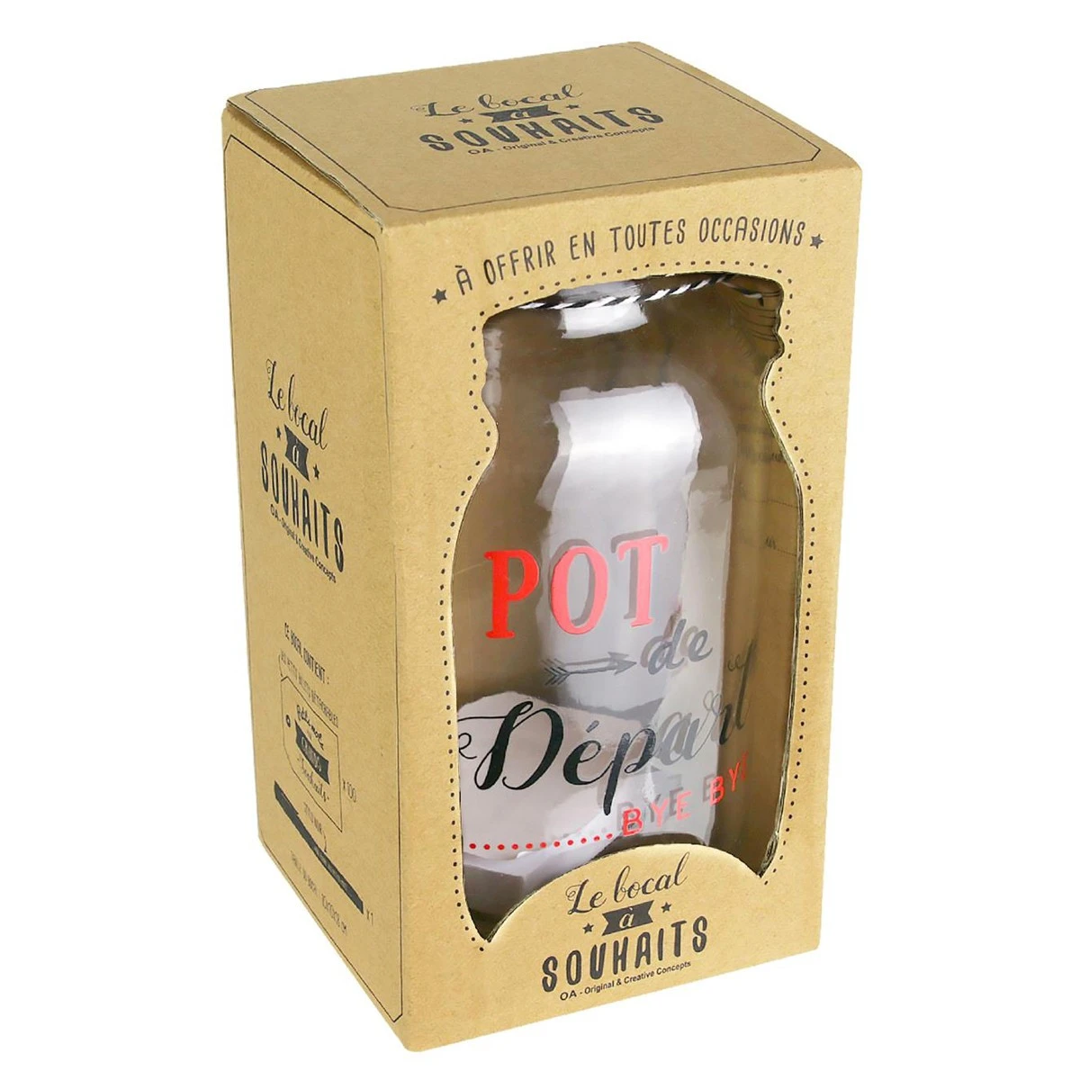 Robert du service commercial quitte l’entreprise pour une retraite méritée après 40 années de bons et loyaux services ? Martine change de région pour aller vivre aux Antilles avec sa famille ? Organisez un pot de départ et offrez la Présentée sous la forme d’un joli bocal en verre avec un couvercle métallique comportant une fente, est livrée avec une centaine de petits tickets à souhaits qu’il vous suffit de remplir avec le stylo « pour écrire des petits mots » fourni. Ecrivez un gentil message, un remerciement, une pensée, un souhait, une anecdote et glissez les messages dans le . Offrez la remplie de petits messages, vous pouvez également y glisser des photos ou des objets précieux. La personne qui reçoit le bocal aura juste à piocher à l’intérieur pour découvrir les qui lui sont destinés. Sortez les mouchoirs !