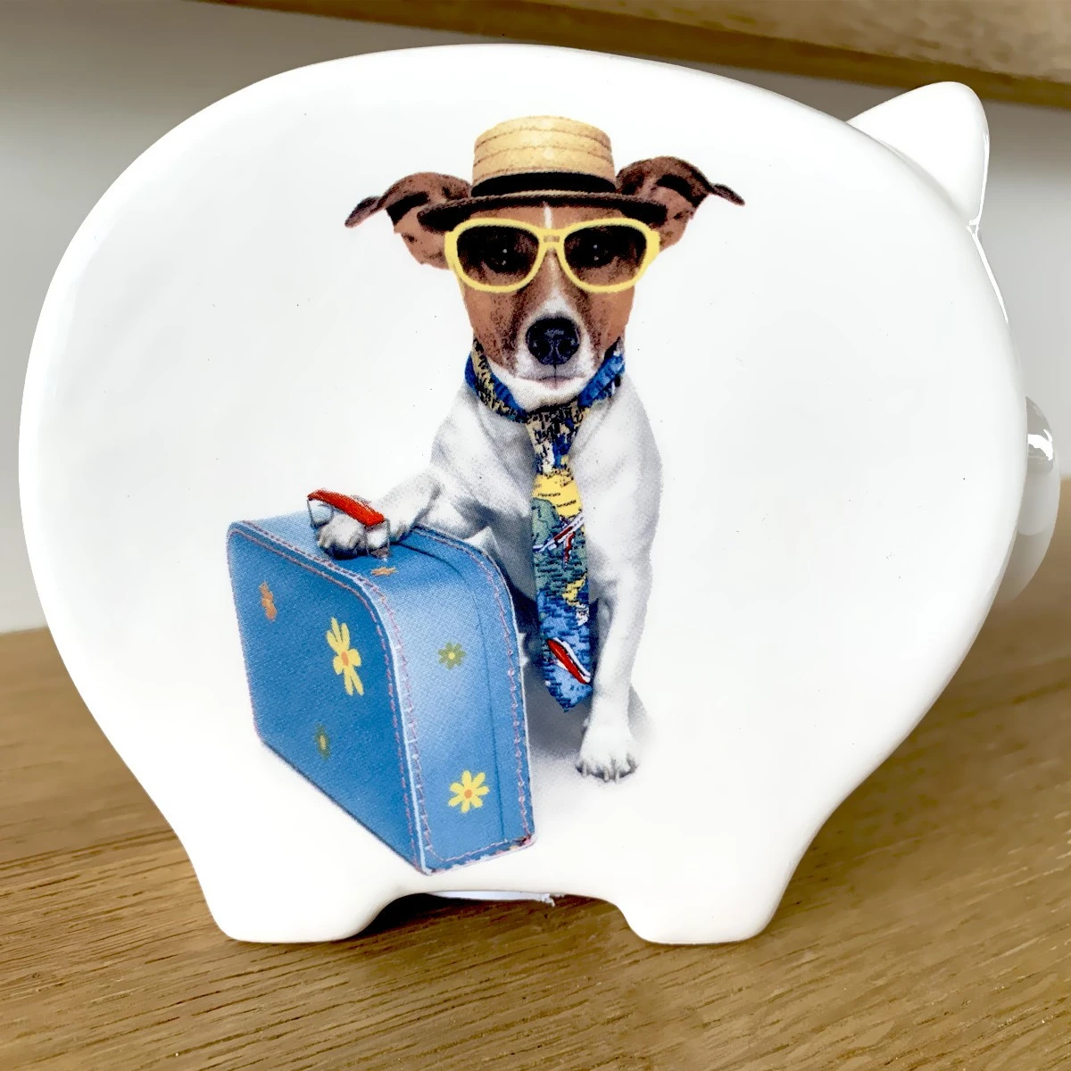 Ce cochon atypique est plat des deux côtés, ce qui vous permet de la ranger entre deux livres par exemple. Comme toute tirelire, la est pourvue d’une fente sur le dos afin d’y glisser toutes les participations des collègues à votre pot de départ à la retraite. Une petite cagnotte qui vous permettra de vous offrir le cadeau qui vous fera plaisir. Une face jaune avec l’inscription « Cagnotte de la Retraite » et un drôle de chien avec des lunettes et un chapeau de paille, visiblement prêt à partir en vacances avec sa valise. Lorsque la sera pleine, il vous sera facile de la vider en enlevant le bouchon de caoutchouc dans la partie inférieure.