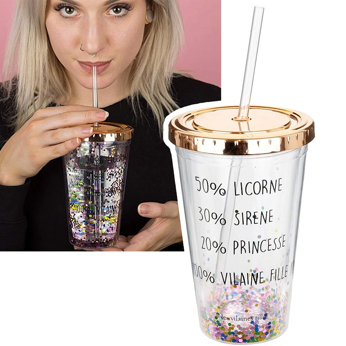 Avec ce vous allez pouvoir déguster toutes vos boissons préférées, vos smoothies, vos jus détox, vos boissons drainantes, vos Mojitos ou même vos Spritz, en bref tous les breuvages que les « vilaines filles » adorent siroter à bout de paille au quotidien. Le est absolument girly ! sa double paroi renforce l’isolation de votre boisson pour maintenir sa température plus longtemps et contient en plus des paillettes multicolores absolument ravissantes qui décoreront avantageusement tout le pourtour du verre. Enfin, le couvercle à vis est cuivré pour plus d’élégance et la paille est en plastique alimentaire dur pour une réutilisation à volonté ! Un cadeau parfait à offrir à une fille qui adore se maintenir hydratée au quotidien.