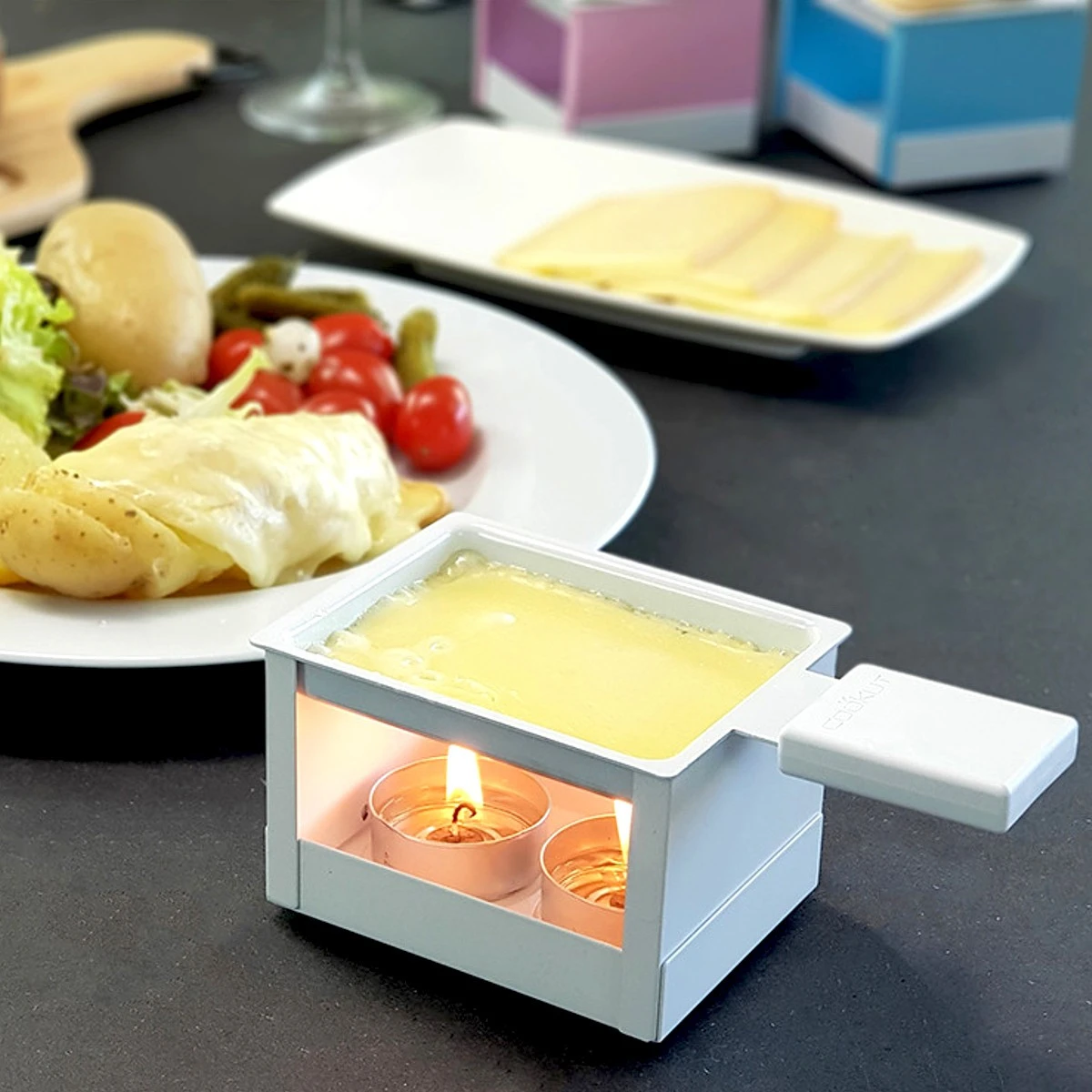 Plus besoin de sortir l’encombrant et énergivore appareil à raclette ! avec , vous pourrez vous faire facilement une raclette en quelques minutes même si vous êtes seul(e). Assemblez votre raclette individuelle en un tour de main et posez-la à côté de votre assiette. Pas besoin d’électricité ni de rallonge électrique, il suffit d’allumer deux bougies chauffe-plats sur le socle et le fromage à raclette fondra en trois minutes, aussi vite qu’avec un appareil à raclette électrique. Equipez-vous d’autant de que vous avez de convives, c’est la garantie d’un moment ultra sympathique entre amis. Une fois votre raclette dégustée, il vous suffira de nettoyer Yéti, en la plaçant directement au lave-vaisselle. Génial non ? cerise sur le gâteau (ou sur la raclette) Yéti, Raclette individuelle à la bougie est un produit ! Comme Yéti est compact, vous pourrez l’emporter facilement partout !